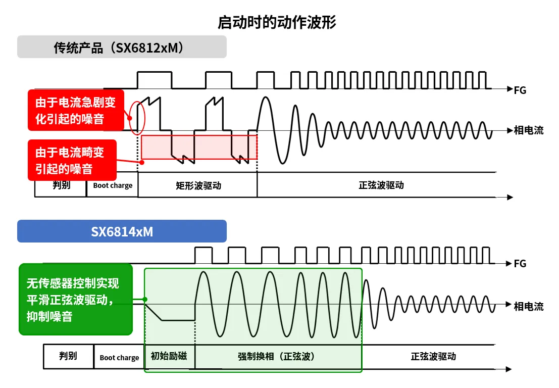 SX6814xM系列在启动时,通过无传感器控制实现正弦波驱动,停止时则采用电流逐步下降的ramp-down控制,有效降低噪音。