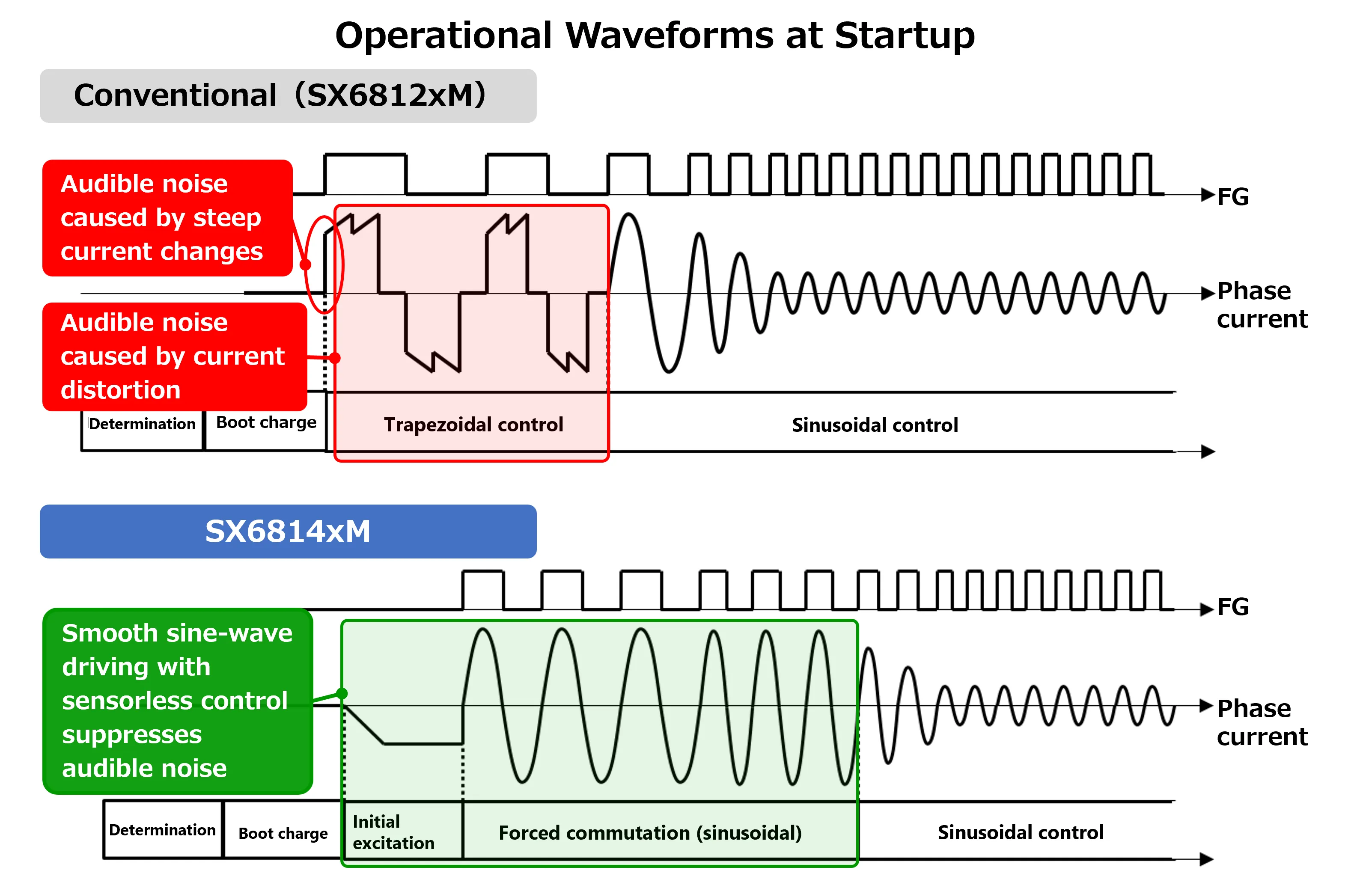 For audible noise suppression, the SX6814xM series employs a sensorless-controlled sine-wave driving system at startup and ramp-down control during stop operation to gradually decrease the current.