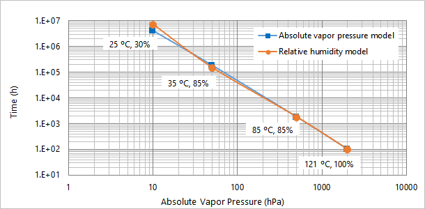 Below is an example of the correlation curves which were derived from the absolute vapor pressure and relative humidity models applied to our pressure cooker test (121 °C, 100%, 100 h), based on the definitions above.