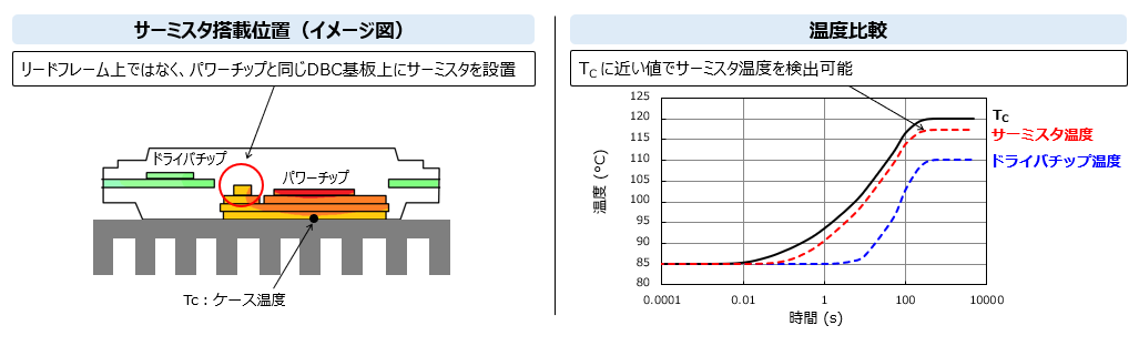温度検出用のサーミスタは、リードフレーム上ではなく、パワーチップと同じDBC基板上に設置しています。